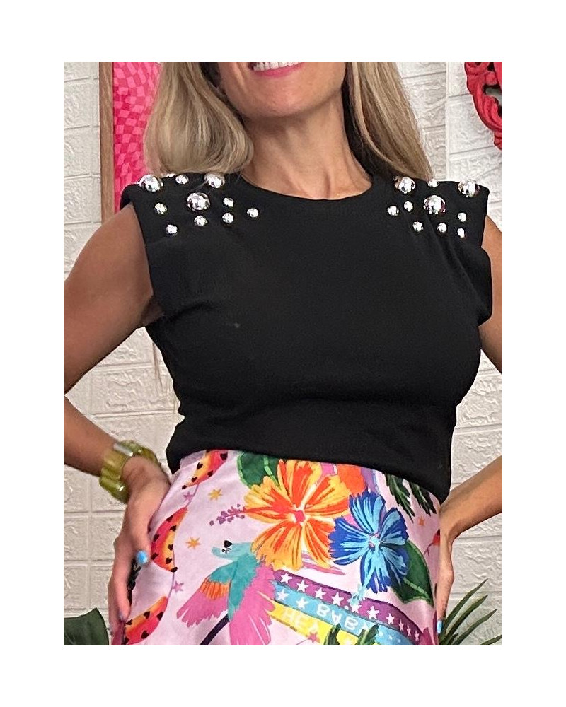 Camiseta manga sisa con detalle de tachuelas y hombreritas en los hombros. Cuello redondo.