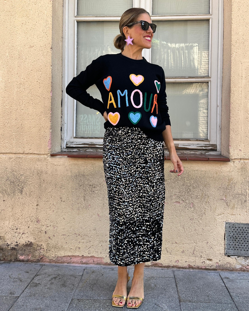 Falda de lentejuelas corte midi. Cintura elástica. Tejido muy elástico. Talla única. Válido para talla S a L.