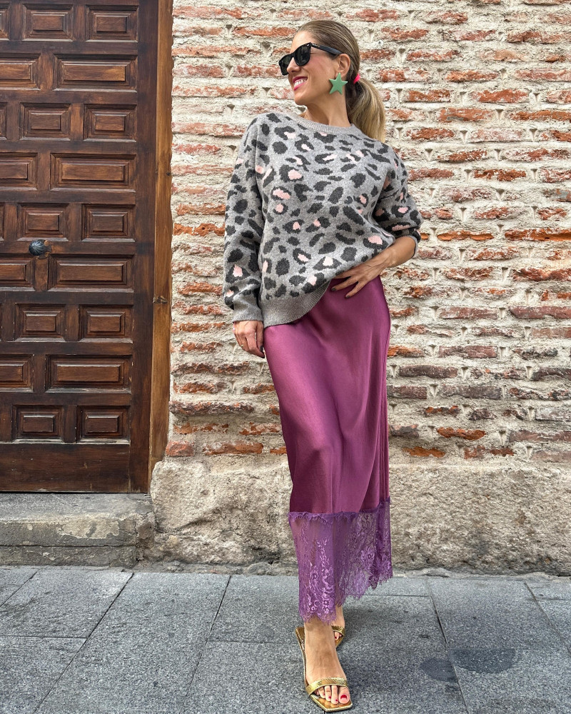 Falda satinada y bajo con encaje, cintura elástica, talla única valida para tallas desde la S a la L.
