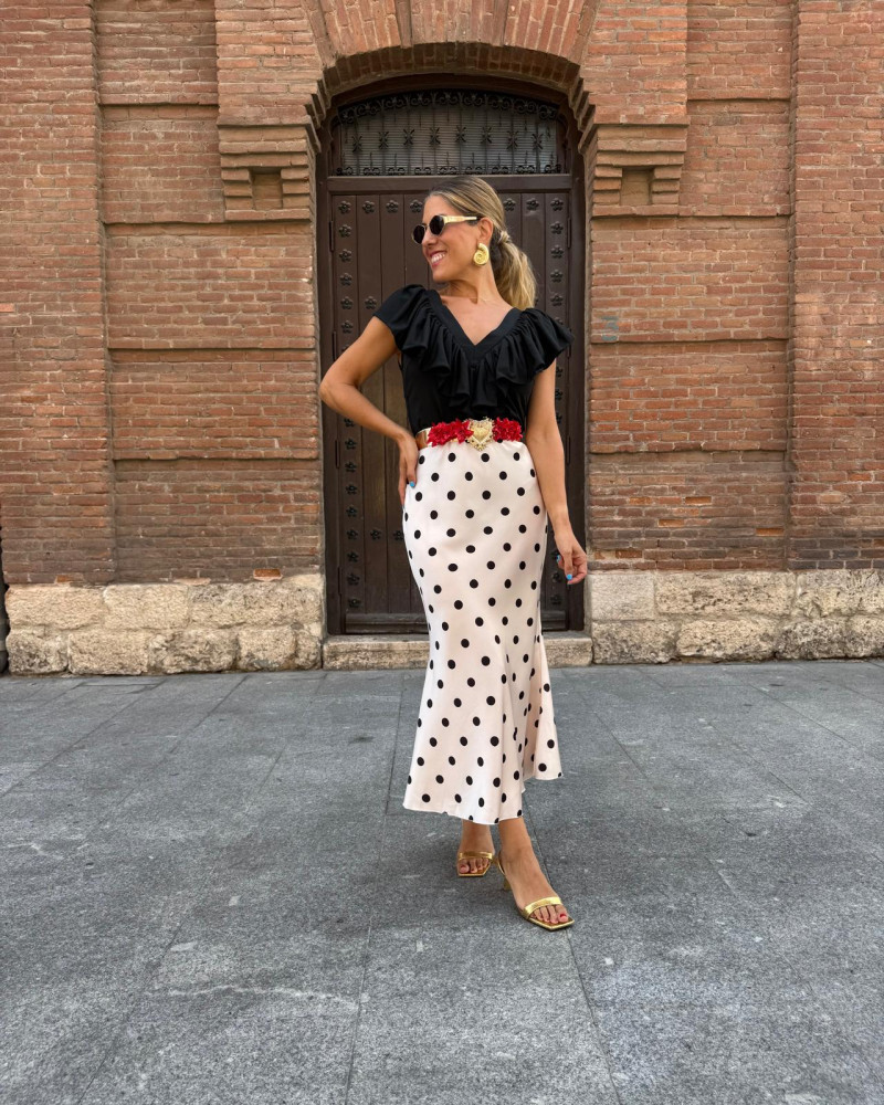 Ideal para combinar con blusas básicas o tops de fiesta, esta falda de lunares midi es perfecta tanto para looks casuales como para eventos especiales. Una prenda imprescindible para dar un aire femenino y sofisticado a tu armario.