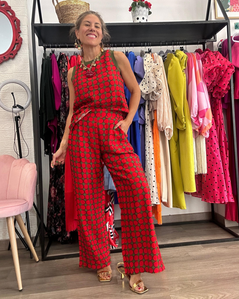 Conjunto de lunares combinado en verde oliva y rojo de corte fluido pantalón y top con aberturas, ideal para lucir comoda y original.