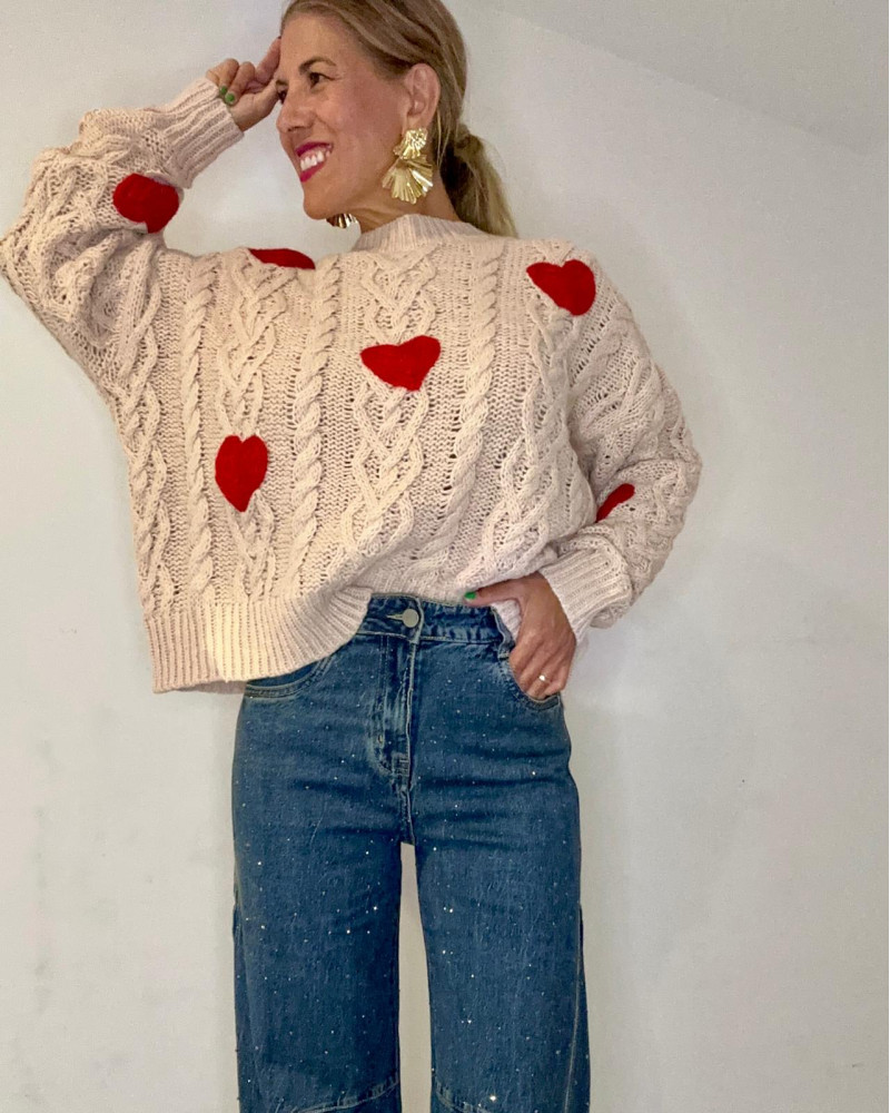 Jersey de punto en color crudo con diseño de corazones rojos. Suave, cálido y perfecto para aportar un toque romántico y divertido a tus looks.