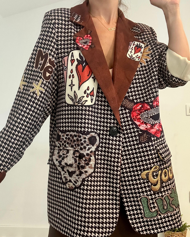 Blazer elegante y versátil con estampado y detalles exclusivos. Perfecto para darle un toque original a cualquier look, ya sea casual o formal.