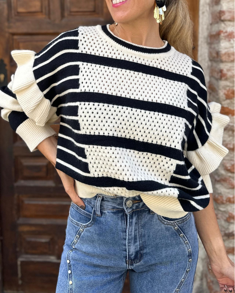 El Jersey Olivia destaca por su tejido suave y agradable al tacto, ofreciendo confort sin renunciar al estilo. Su diseño de rayas en contraste y el corte holgado crean un look actual y versátil que se adapta a cualquier ocasión.