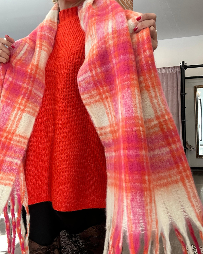 Bufanda de cuadros suave y elegante, perfecta para aportar calidez y estilo durante los días fríos. Un accesorio versátil que combina fácilmente con cualquier look.