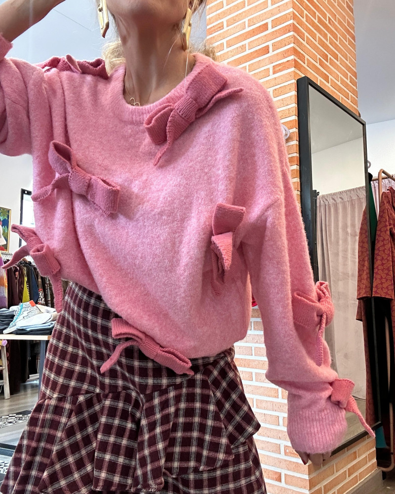 Un jersey ligero y femenino con detalle de lazos, ideal para looks cómodos y versátiles en invierno.