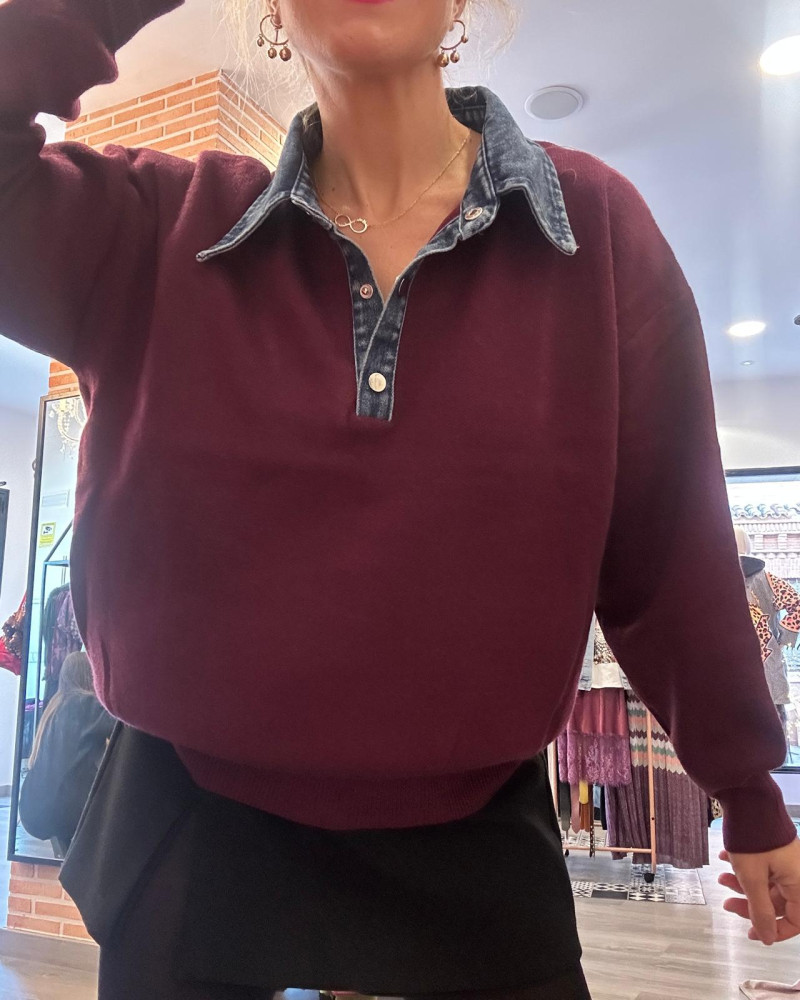 Jersey de punto suave con cuello camisero en contraste. Un básico elegante y cómodo, ideal para el día a día con un toque especial.