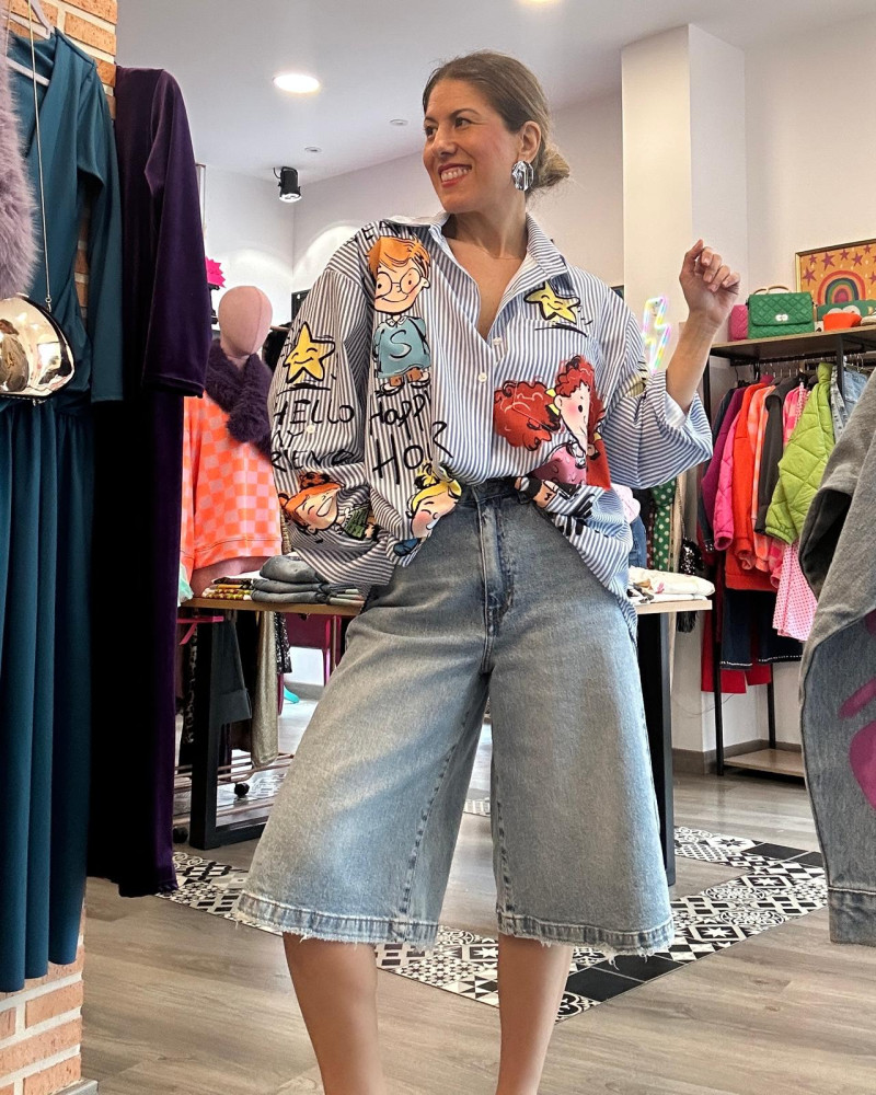 Camisa de rayas estilo oversize con un diseño original y lleno de personalidad. Presenta ilustraciones y detalles gráficos en la parte frontal y trasera, incluyendo un llamativo dibujo en la espalda que aporta un toque moderno y atrevido.