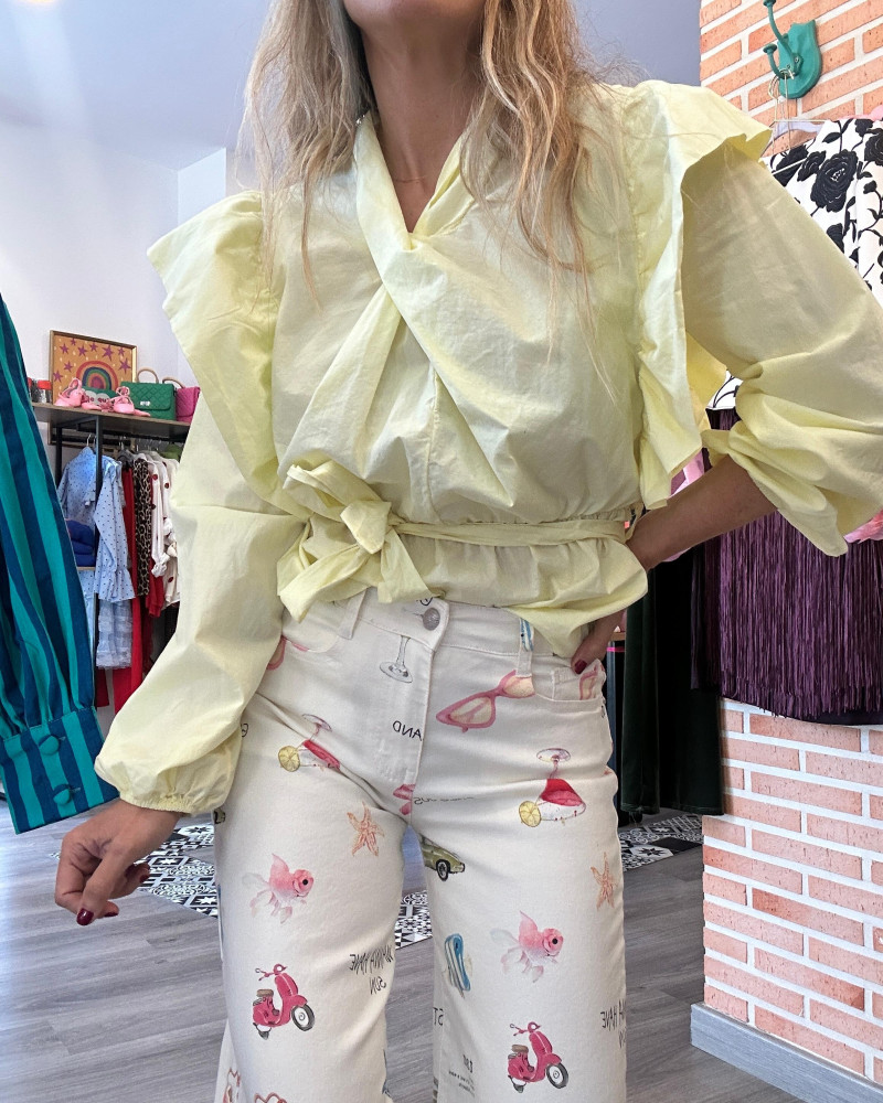 Destaca por sus volantes decorativos en la parte frontal, que aportan movimiento y un estilo delicado. Su corte favorecedor se adapta perfectamente a la silueta, permitiendo combinarla tanto con pantalones como con faldas para crear conjuntos casuales o más formales.