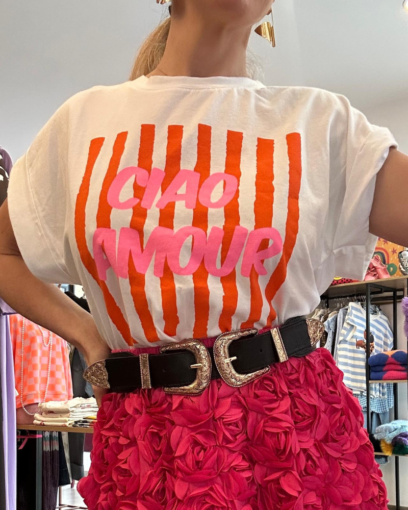 Camiseta blanca con estampado “Ciao” en colores vibrantes que aporta un toque fresco, divertido y moderno a cualquier look. Perfecta para combinar con faldas, jeans o pantalones para un estilo casual con personalidad.