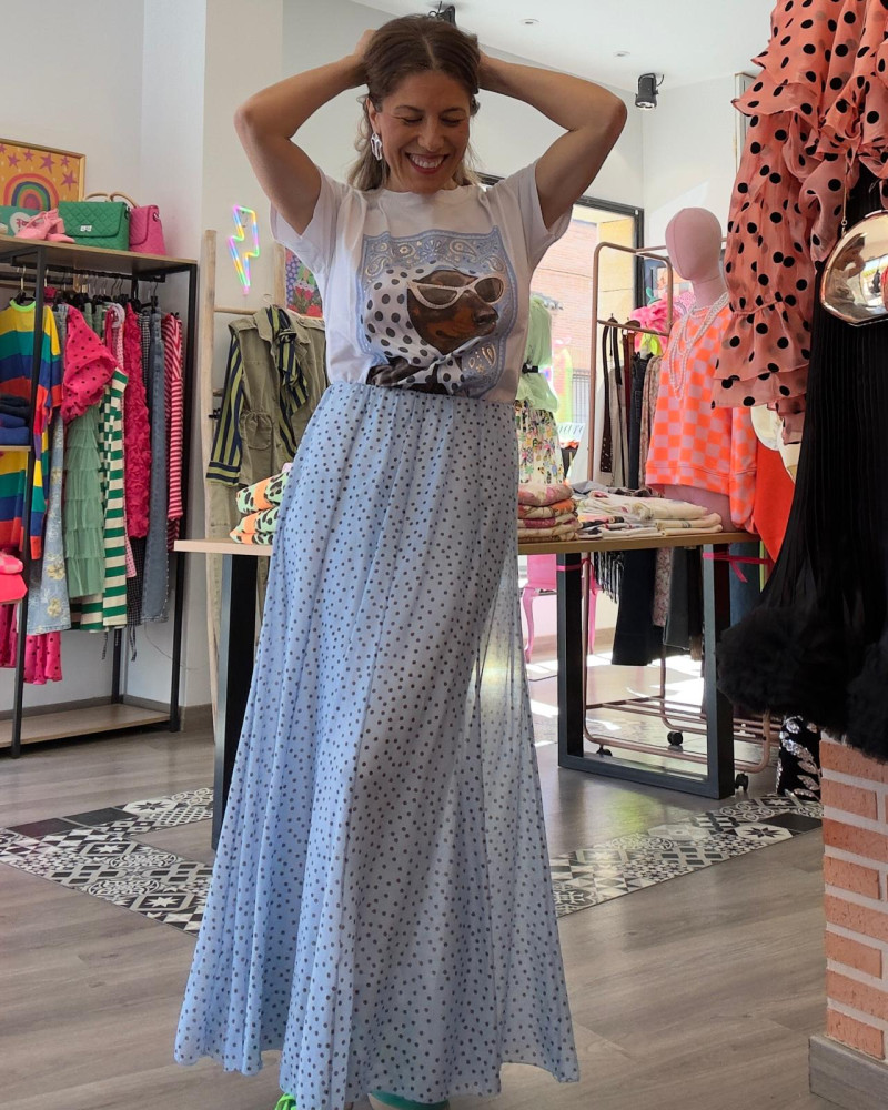 Falda midi de lunares con un estilo fresco y atemporal. Ideal para combinar con básicos y resaltar tu look en cualquier ocasión. Tejido ligero con caída elegante y ajuste cómodo.