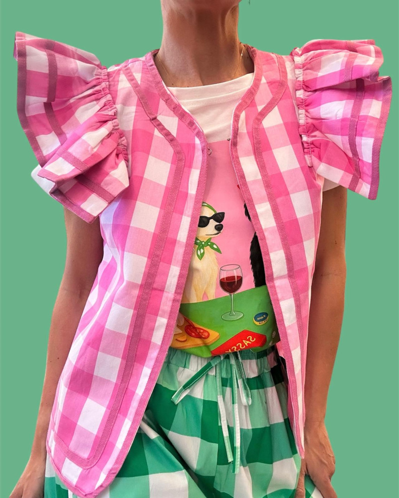 Chaleco con estampado vichy en tonos rosa, con diseño alegre y volantes decorativos. Una prenda ligera y cómoda, perfecta para combinar con faldas o pantalones y crear looks frescos y divertidos.