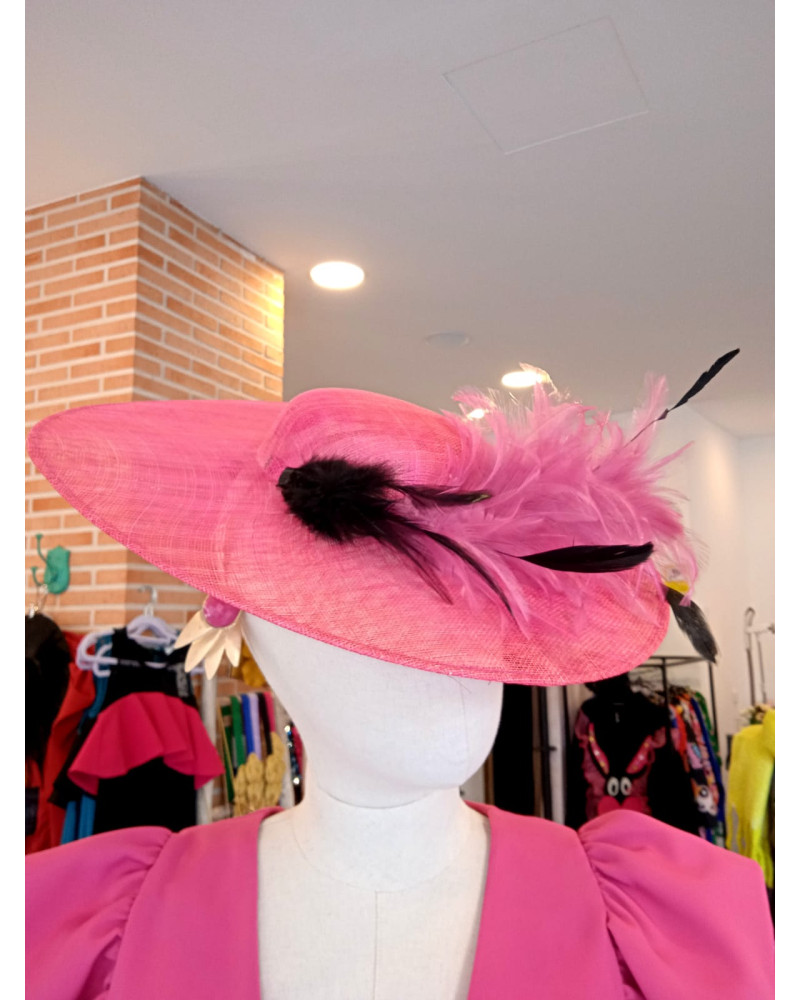 Semi pamela en color rosa con detalle plumas en tonos rosa y negro.