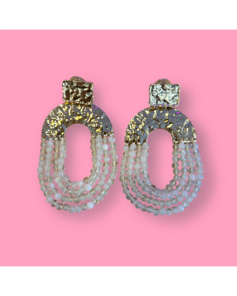 Estos pendientes han sido diseñados para la mujer que busca accesorios con personalidad y un acabado detallista. Su forma geométrica ovalada y el delicado trabajo de pedrería/cuentas crean un efecto visual único que combina la modernidad con la esencia de lo hecho a mano.
