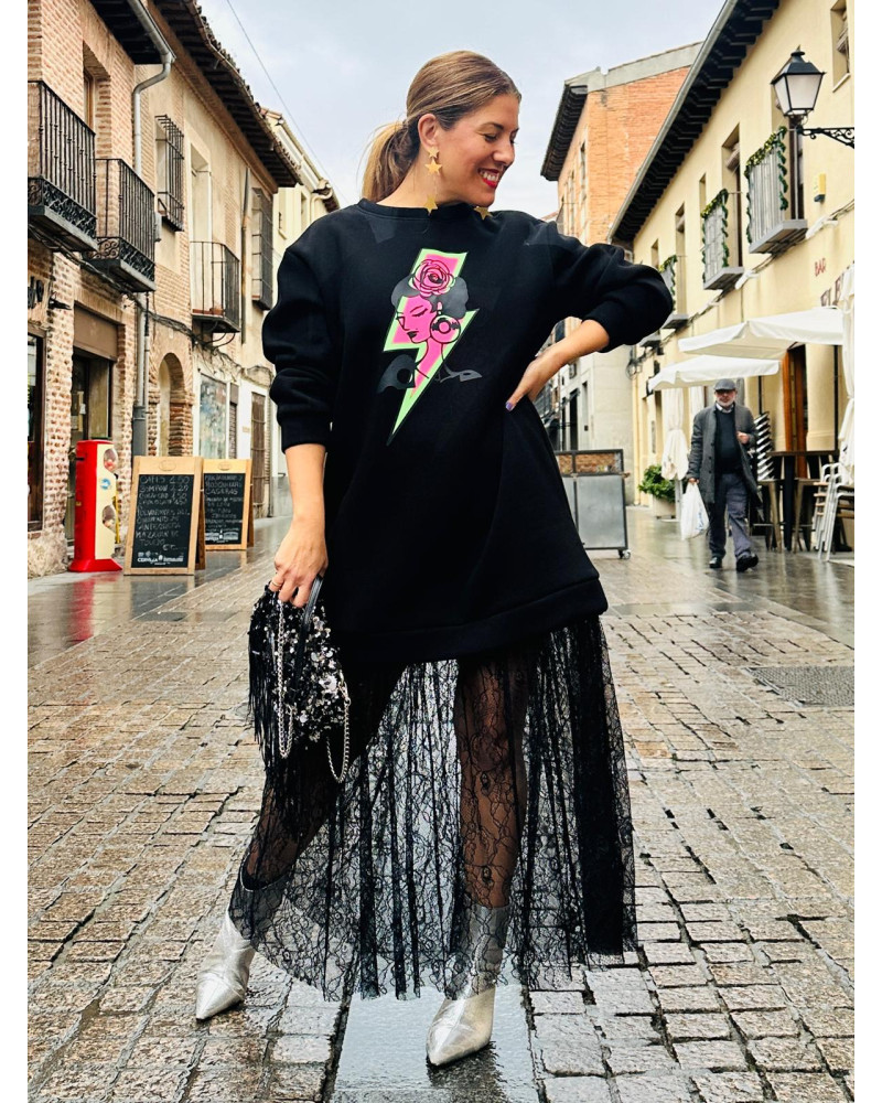 Maxi vestido en tejido de sudadera con nuestro precioso logo de Mariquilla.Terminación en encaje. Talla única. Válido para talla S a L.
