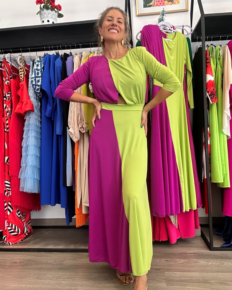 Vestido midi combinado en dos colores. Mangas con hombreras. Pequeña abertura central que da originalidad al vestido. Cuello caja. Corte evasé.Talla única. Válido de una S a L Un vestido muy original que se llevará todas las miradas.