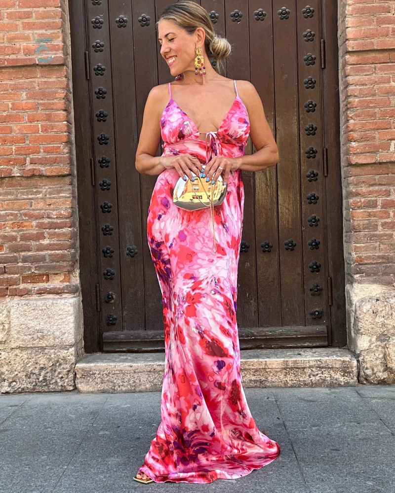 Vestido estampado largo con espalda abierta, ideal para noches de verano, invitadas de tarde/noche. Una opción muy original y versatil.