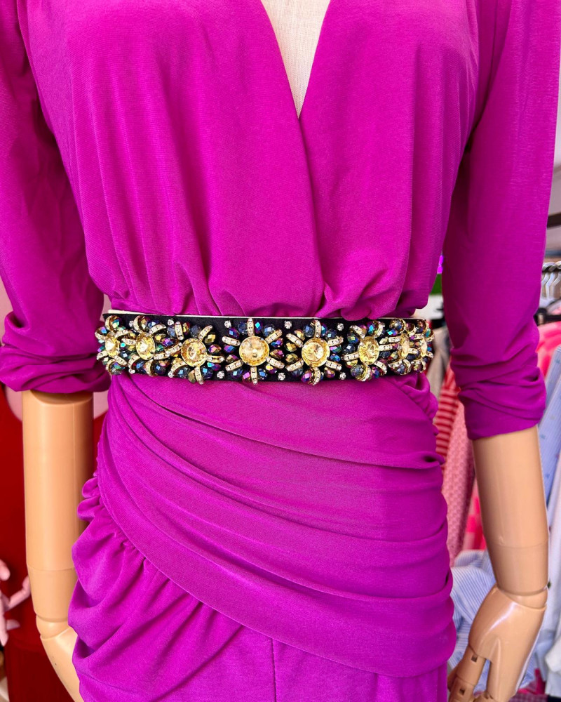 Este cinturón no es solo un accesorio, es la pieza clave para transformar un estilismo sencillo en uno deslumbrante. Diseñado meticulosamente con aplicaciones de cristales de alta calidad, captura la luz en cada movimiento, garantizando que seas el centro de atención.