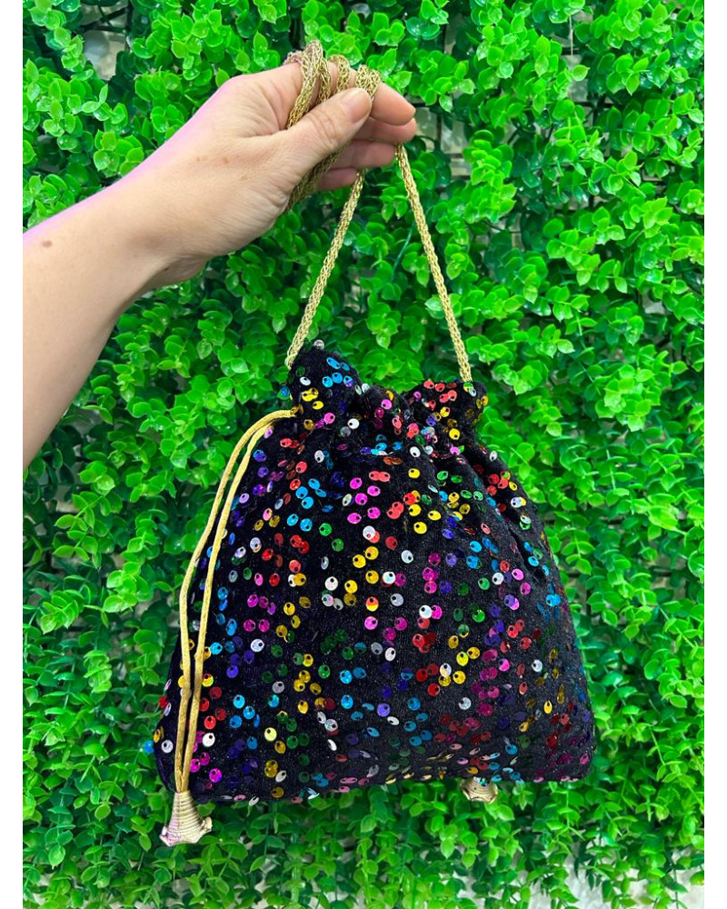 Bombonera terciopelo con lentejuelas en distintos tonos. Cordón dorado para llevar en bandolera o con un nudo como bolso de mano.