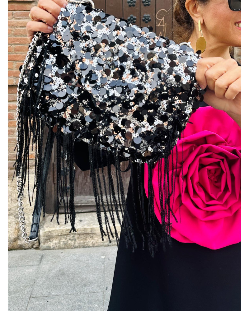 Bolso de lentejuelas en negro y plata. Tira extraible para llevar bandolera. Terminación con flecos. Interior forrado con bolsillos. Cierre con cremallera e imán.