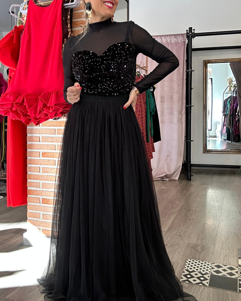 Top lentejuelas con espalda y mangas transparente. Escote corazón.