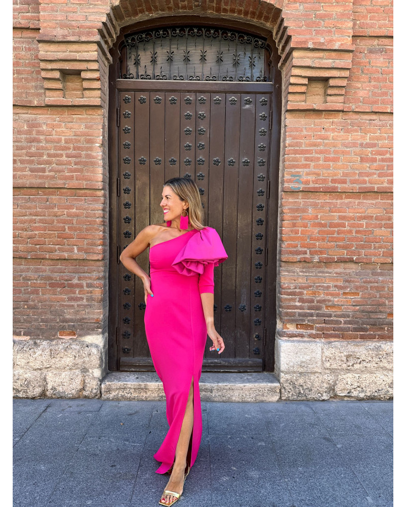 Vestido largo con abertura. Escote asimétrico con volantes. Cierre trasero con cremallera.