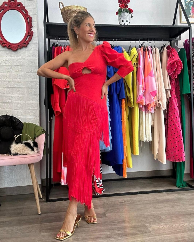 Vestidazo con escote corazón asimétrico. Falda con flecos. Cierre con cremallera trasera. Un vestido sexy y elegante con el que serás la invitada perfecta.