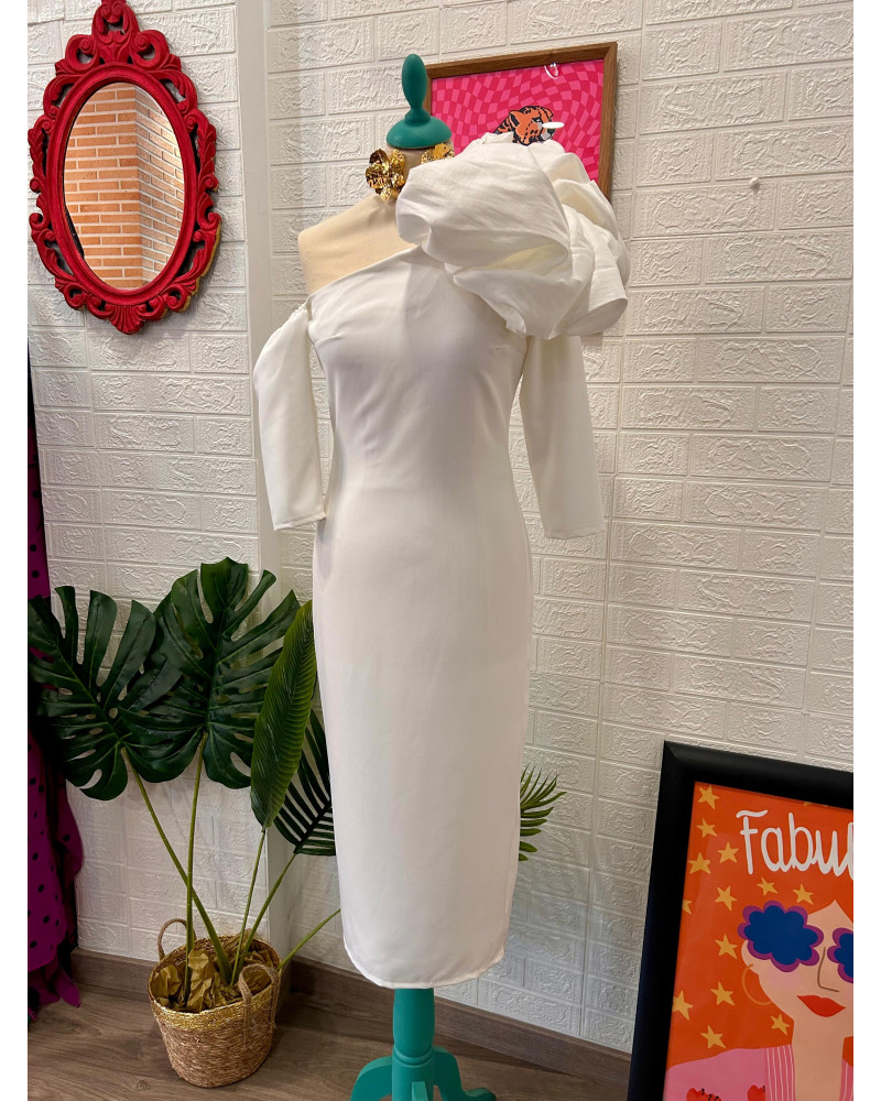 Vestido midi. Escote asimétrico con maxi volantes en el hombro. Cierre con cremallera en espalda. Un vestido ideal para una novia diferente o mamas de comunión con un estilo original.